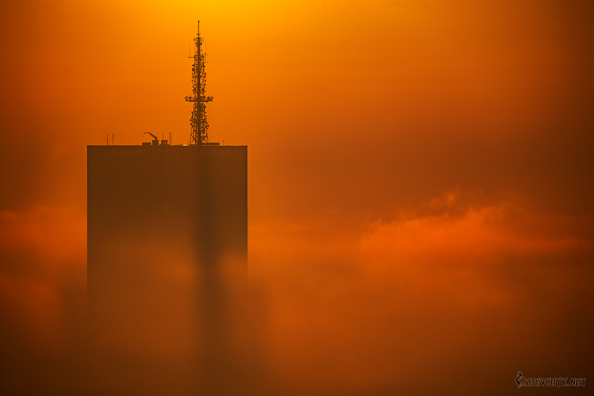 Mariott hotel in a foggy day in Warsaw. Poland.